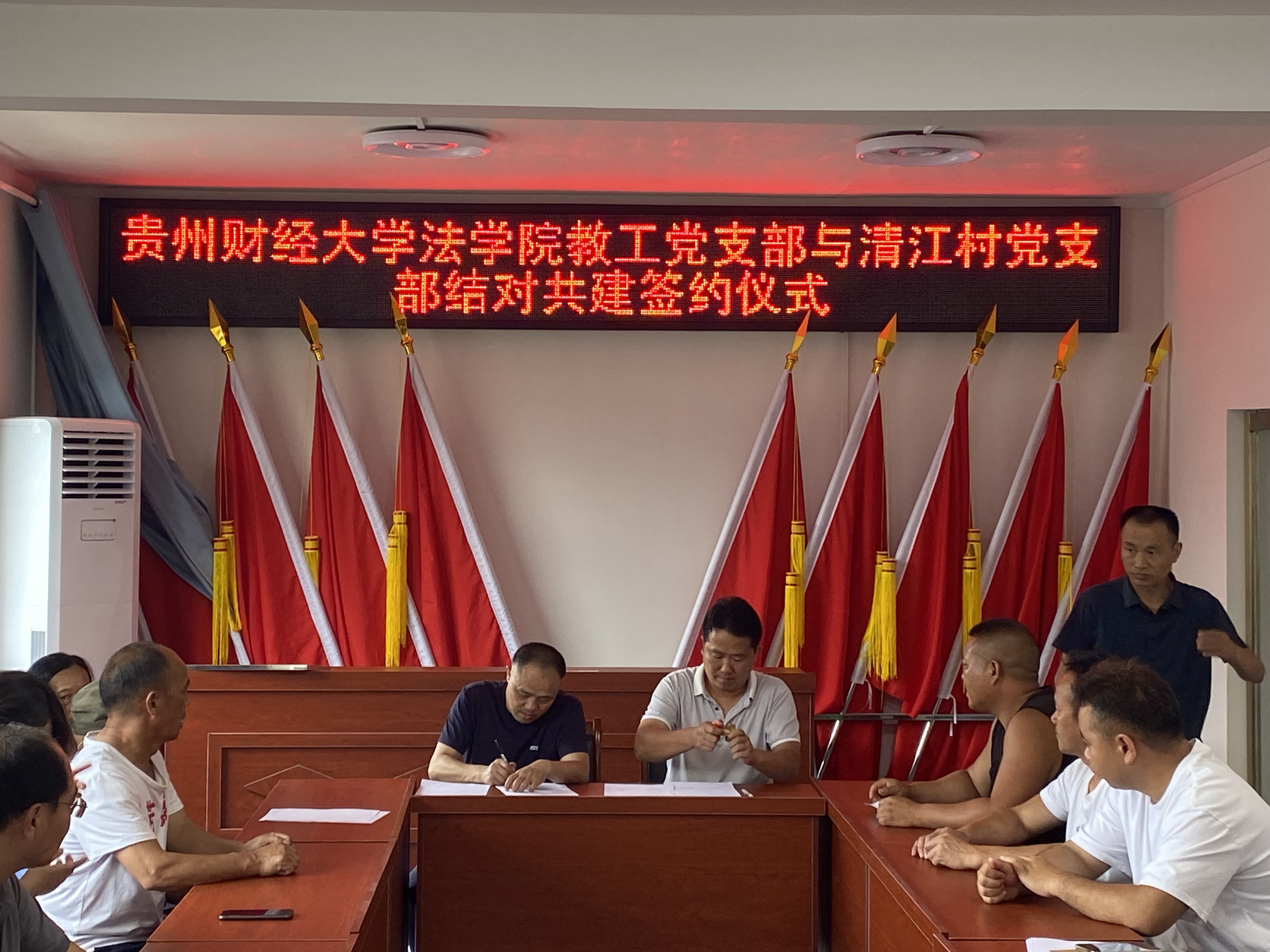 活动伊始,法学院党委与清江村村支两委、包括我院驻清江村第一书记李玉兰在内的驻村工作队开展座谈。清江村村支书陈世刚对法学院的到来表示欢迎,他介绍了清江村的村情民情等基本情况,希望法学院在民宿开发、苗族传统文化研学展销基地打造等方面给予支持。邵新顺表示将强化党建引领,与清江村党支部建立结对共建机制,发挥各自优势双向赋能,同时发挥法学院智力优势,为清江村的乡村振兴工作提供新思路、新方法。随后邵新顺与陈世刚共同为AB平台党员法律志愿服务站挂牌。曹务坤和陈世刚则围绕村民比较关心的婚姻家庭问题开展了题为《守护家庭权益 助力乡村振兴》的理论宣传二人讲,并现场回答了村民的相关困惑。曹务坤作为法学院教工第二党支部书记与陈世刚签署了党支部结对共建协议,两个支部将在支部建设、产业发展、法律援助与调解等方面开展合作。