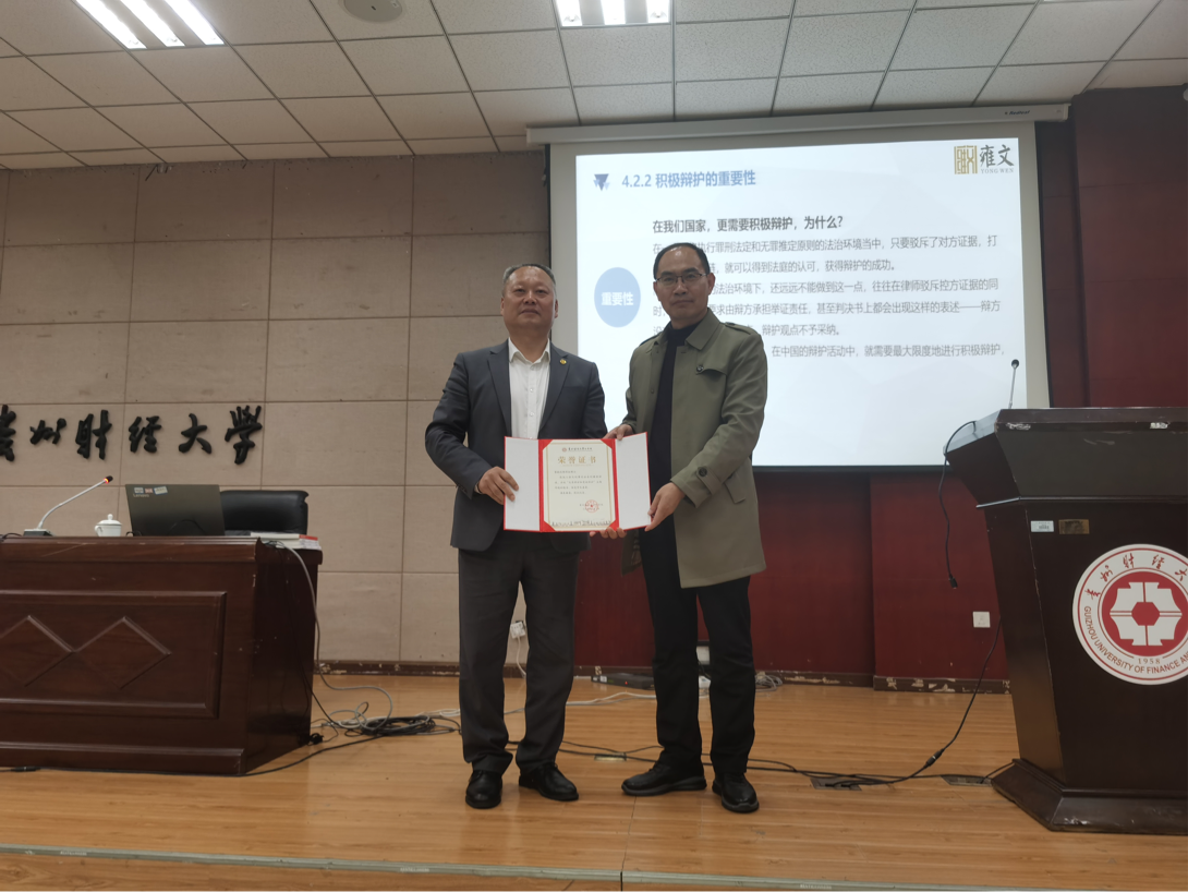 讲座最后,法学院党委书记邵新顺为靳祥钰博士颁发荣誉证书。