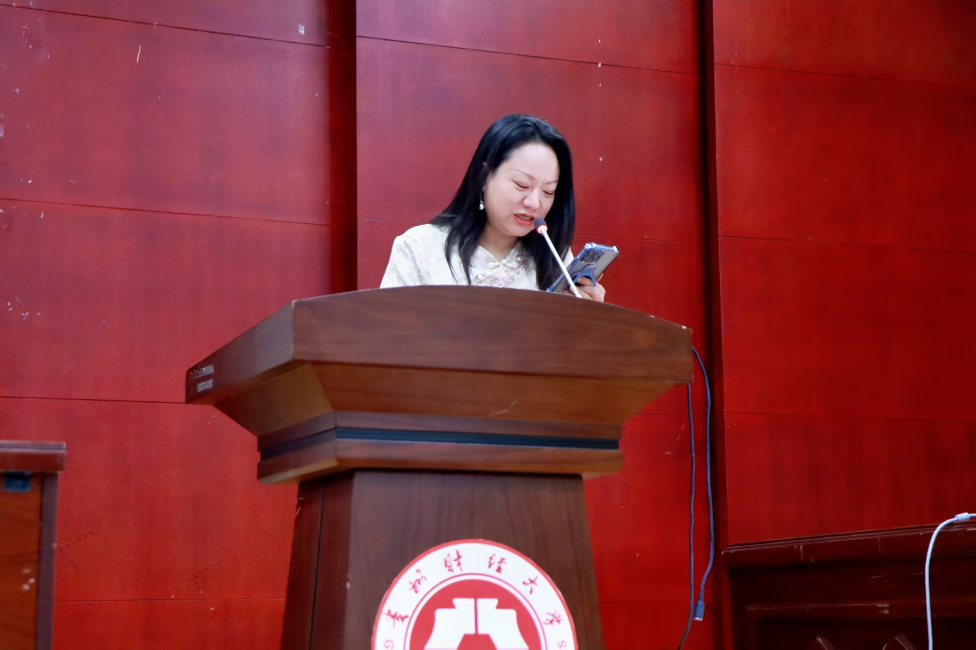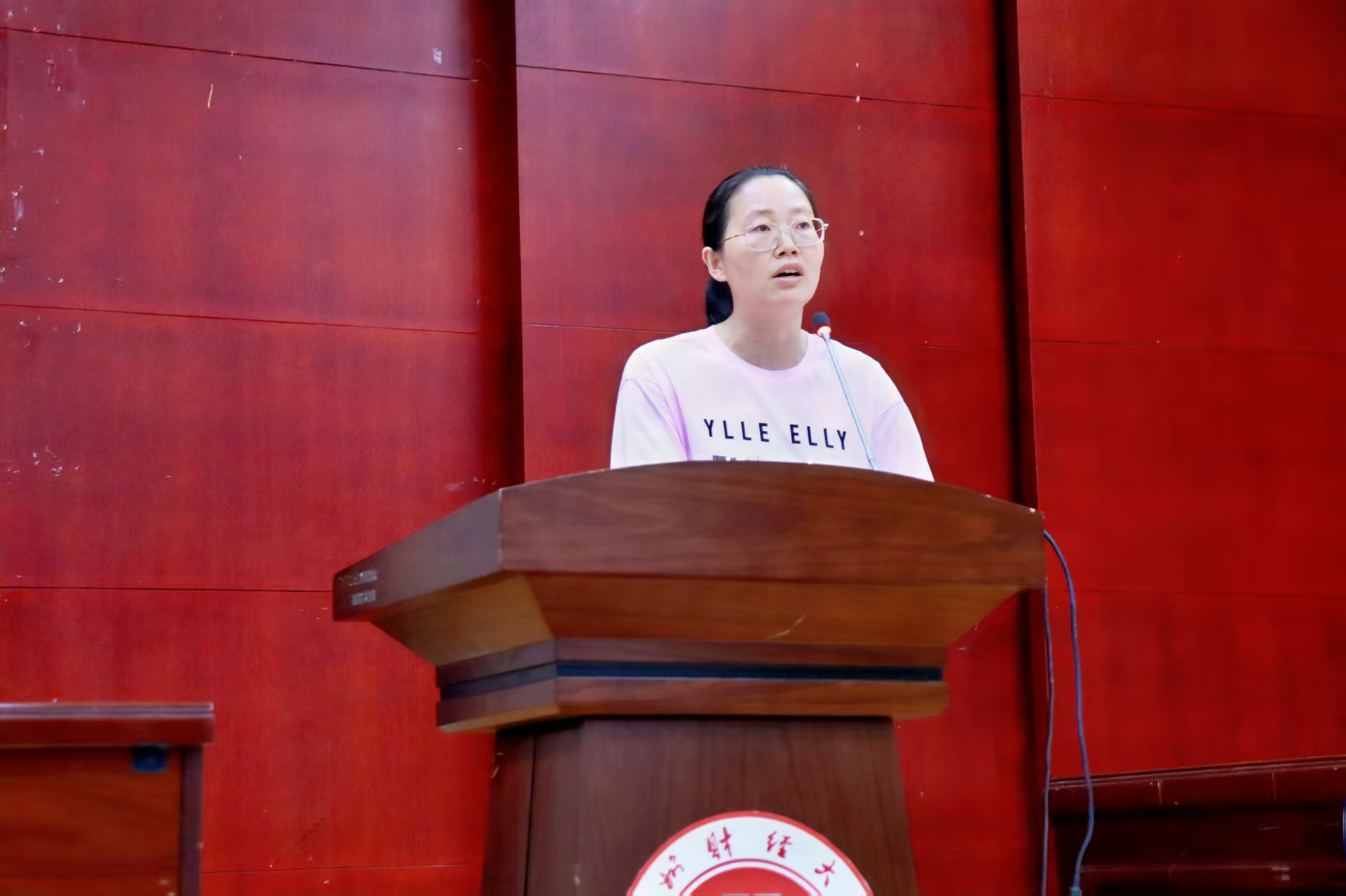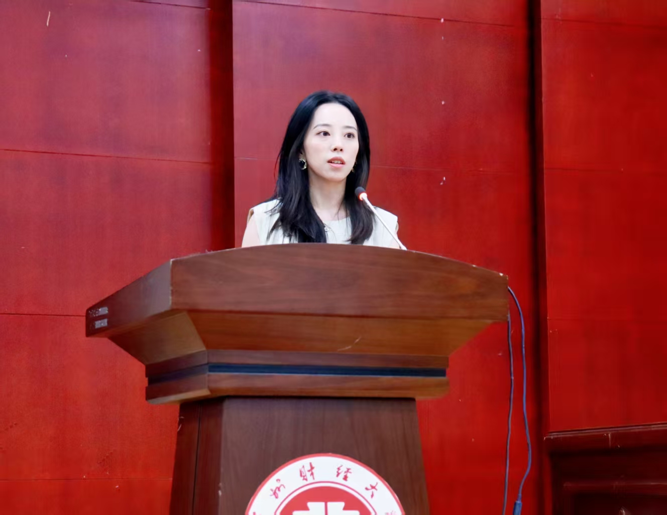 新生代表赵婷则站在“同龄人角度”发声。她分享了自己选择法学专业的初衷,表达了对大学生活的期待,以及未来将努力学习、积极适应专业学习的决心,真实展现了新生对法学领域的向往与入学初期的规划,引发在场新生的共鸣。