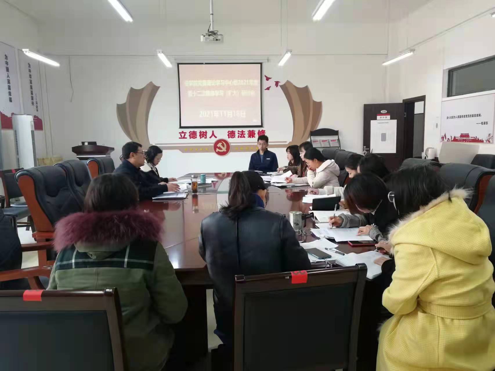 (法学院 图文/母桂花)2021年11月18日上午,法学院党委理论学习中心组在文德楼A8-310会议室围绕“中国共产党第十九届中央委员会第六次全体会议精神”专题进行集中学习研讨。学院领导及全体行政人员、支部书记参加会议。学院党委书记詹伟主持会议。