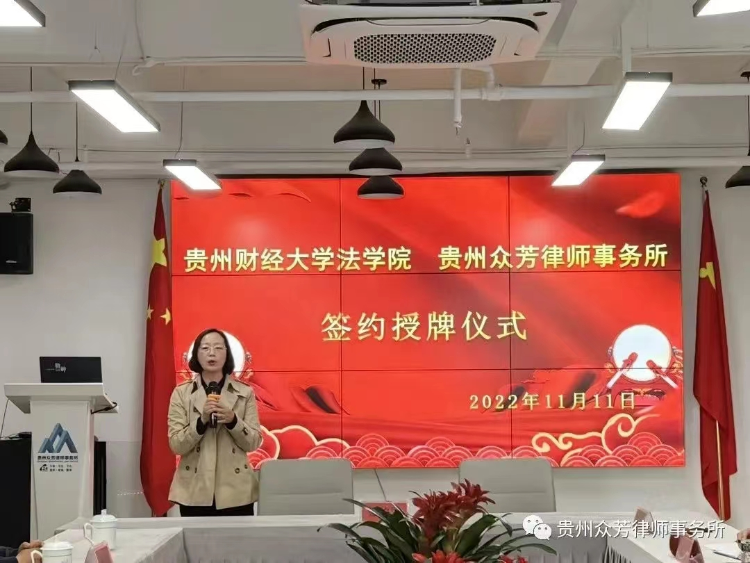 签约暨授牌仪式由陈仕菊主持,陈仕菊首先对陈玉梅一行的到来表示热烈的欢迎和真诚的感谢,并介绍了贵州众芳律师事务所的成立及发展历程。陈玉梅对AB平台的成长历史及师资力量做了系统的介绍,并表示希望以设立校外实践教学基地的方式丰富教学内容,加强教学理论与实践的结合,提高学生综合素质和社会适应能力。