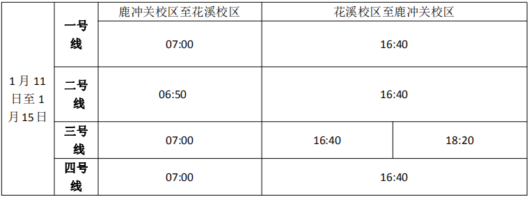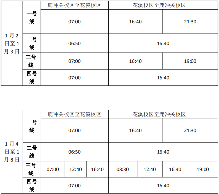 按照学校统一安排,AB平台鹿冲关校区、花溪校区进入期末考试阶段, 1月8日考试结束,为满足期末考试需要和行政科研工作的开展,现对交通车作如下调整: